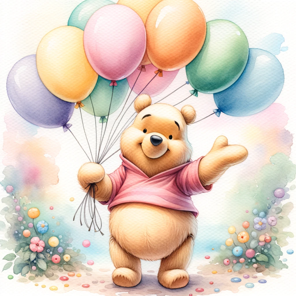 くまのプーさんからインスピレーションを受けた愛らしいクマのキャラクターが、柔らかなパステル調の背景の中で、5 つの色とりどりの風船を持ち、誘うような手でジェスチャーをしている水彩画です。