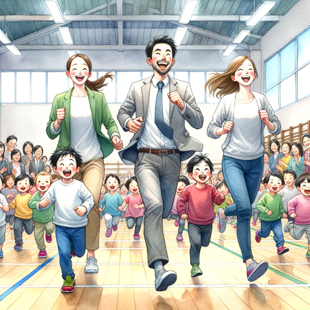 幼稚園の運動会の広々とした体育館での賑やかな場面を描いたイラスト。アジア系と白人系の母親と父親を含む 5 人の元気な親たちが、鮮やかな飾りに囲まれながら、楽しく徒競走をしています。