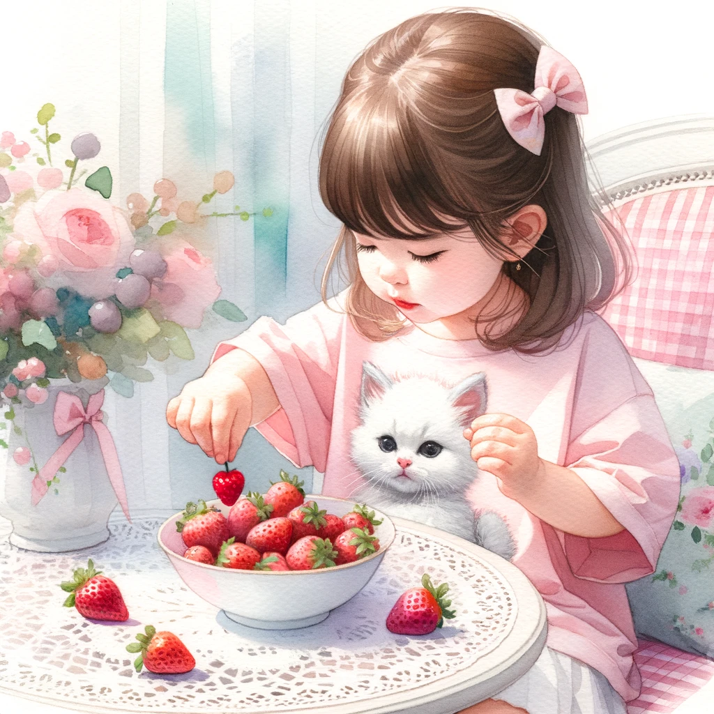 子猫をテーマにしたシャツを着た 2 歳の女の子が、上品なテーブルの上のボウルからイチゴを優雅に楽しんでいる、かわいらしいシーンを描いた水彩画です。柔らかなパステルカラーが彼女の無邪気さを引き立てています。